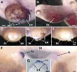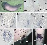 Fig. 5. Expression of Xmmp-9 mRNA associated with corneal wound healing, in various epithelial wounds, and during the earliest stage of limb regeneration following amputation. A: Left superolateral view 24 hr after lens removal. Expression is restricted to the posterior corneal wound. Pigmented spots on the surface of the eye are xanthophores, which normally develop even in many albino embryos. B: Leftlateral view showing expression associated with a lateral epithelial wound 24 hr after surgery in a young stage 41 larva. C: Absence of expression in the unoperated control eye of a stage 52 tadpolelarva. D: Expression of Xmmp-9 in sham operated specimens 24 hr after incision of the outer corneaepithelium. E: Negative control with no detectable hybridization of sense RNA probe to the wounded cornea 24 hr after incision of the outer corneal epithelium. F: Xmmp-9 expression in the lefthindlimb stump 24 hr after distal amputation in a stage 52 tadpolelarva. G: Longitudinal section of an amputated stage 52 limb 6 hr after amputation. Xmmp-9 mRNA is present in the apical ectodermal cap (ep) and the underlying mesoderm (ms). H: Absence of expression in the hindlimb on the unop- erated side. cn, cornea; cw, corneal wound; hl, unoperated hindlimb; ln, lens; ls, hindlimb stump; lw, lateral ectodermal wound; uc, uninjured cornea overlying the central pupillary space. Scale bar =500 um in A, 200 um in B. Scale bar in E applies to C and D and equals 100um. Scale bar in G 50um.Scale bar in H applies to F and equals 100um.