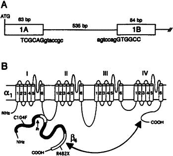 Figure 1 Structure and interactions of CACNB4. A, Intron/exon junctions for exons 1A and 1B. The indicated 5′ end of exon 1A corresponds to the translation-initiation site. The intron sequence is from GenBank (accession number AF216867). B, Locations of mutations in CACNB4. Two domains of CACNB4 that interact with the α1 subunit of the voltage-gated calcium channel are indicated. In the mouse lethargic mutant (designated as “lh”), the protein is truncated upstream of the major binding site. In human mutation R482X, the protein is truncated in the middle of a domain that interacts with the C-terminus of the α1A subunit.