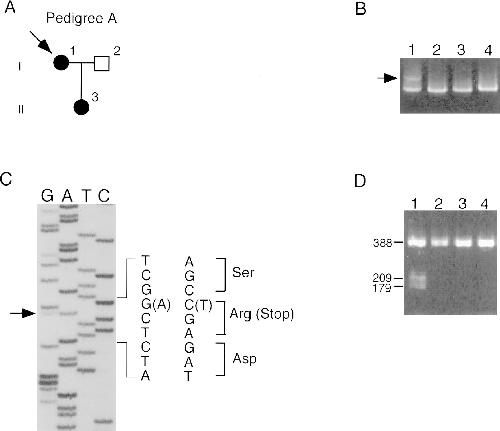 Figure 2 R482X mutation in a family with JME. A, Affected individuals (blackened symbols) are shown, with the arrow pointing to the proband. B, Results of CSGE of exon 13. A unique band seen in the proband (lane 1, arrow) is not observed in three unrelated controls (lanes 2–4). C, The sequence of exon 13 demonstrates that the proband is heterozygous for a C→T transition that generates the premature-termination codon R482X. D, Results of a restriction-site assay for R482X. A 388-bp fragment obtained by digestion of wild-type exon 13 with AluI is shown (lanes 2–4). The internal AluI site produced by R482X results in two fragments (209 bp and 179 bp; see lane 1).