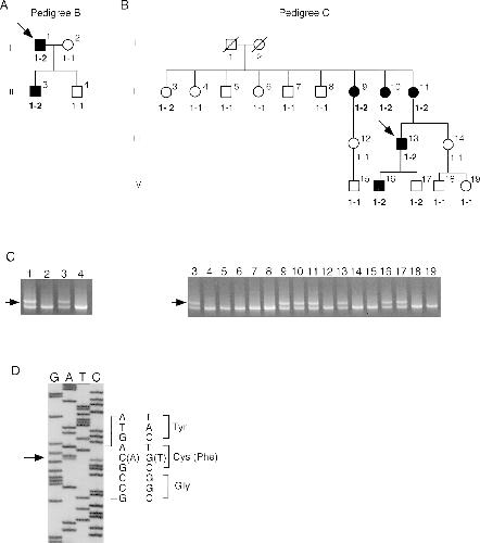 Figure 3 C104F mutation cosegregating with neurological disease in two unrelated pedigrees. A, Pedigree B, which is of German origin and exhibits idiopathic generalized epilepsy. B, Pedigree C, which is of French Canadian origin and exhibits episodic ataxia. C, CSGE analysis of exon 3 from pedigree B (left) and from pedigree C (right). The variant conformer is indicated (arrow). Numbers above the lanes correspond to individuals in the pedigrees. D, Sequence of exon 3 that demonstrates a G→T transversion that changes the wild-type cysteine 104 codon to phenylalanine. CACNB4 genotypes are indicated below the symbols. G = allele 1; T = allele 2.