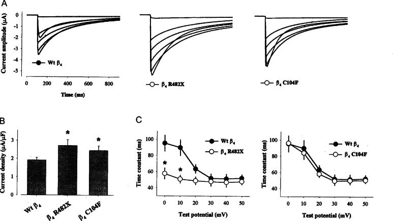 Figure 4 Electrophysiological analysis of mutant β4 subunits. Xenopus oocytes were injected with mRNA from either the wild-type or mutant β4 subunit, in combination with the CACNA1A α1 subunit. A, Sets of current traces at test potentials of −20, −10, 0, 10, 20, and 30 mV. The potential of half-activation was not significantly modified by the mutations, with V1/2=−12.2±0.9 mV (β4-subunit R482X, n=8), −11.3±0.6 mV (β4-subunit C104F; n=8), and -10±0.1 mV (wild-type β4 subunit; n=8). There was a small shift in the voltage dependence of inactivation of the α1A β4-subunit R482X, with half-inactivation potentials of V1/2=-41.1±0.4 mV (β4-subunit R482X; n=7) and V1/2=-37.4±0.5 (wild-type β4 subunit; n=6,). B, Average current density generated by wild-type and mutant channels at a membrane depolarization of 0 mV (peak current amplitude for each subunit combination). The average current density of the α1A wild-type β4 subunit (1.90±0.15 μA/μF; n=8) at 0 mV was increased 1.4- and 1.3-fold, to 2.72±0.25 (n=8) and 2.45±0.24 (n=8), with β4-subunit R482X and β4-subunit C104F, respectively. Asterisks (*) denote statistical significance (t test; P≤.1). C, Average time constants for the fast component of inactivation. At a membrane depolarization of 10 mV, the wild-type current inactivates along three components, a fast-inactivating component (F) with an average time constant of 89.6±5.3 ms (n=7), which constitutes 19.9±3.4% of the total current, a slower inactivating component (S) with an average time constant of 323±37.4 ms (73.9±3.1%), and a noninactivating (NI) component (6.2±0.9%). With β4-subunit R482X, there was no change in the proportion of each component, but the F component demonstrated a faster rate of decrease (50.7±4.7 ms; n=6). The time constants for β4-subunit R482X at 0 and 10 mV are statistically significantly different from those for wild type (P<.01). Values are mean ± SEM.