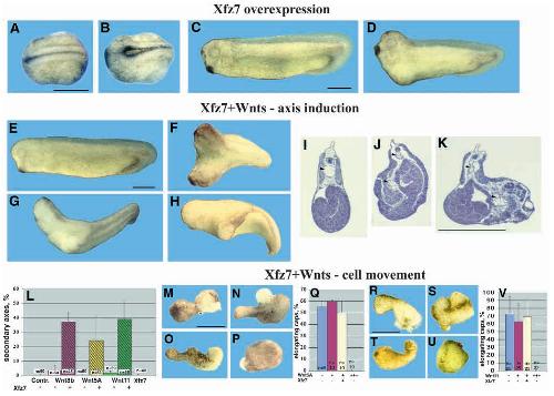 (Q) Xfz7 does not synergize with Wnt5A in blocking the elongation of activin-treated animal caps. (R-V) Coinjection of Wnt11 and Xfz7 does