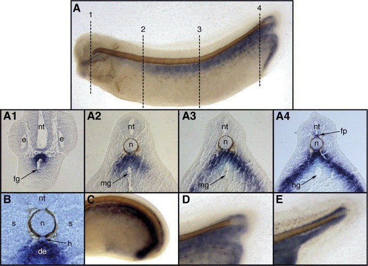 Fig. 2. Embryonic expression of Panza and Edd. Whole-mount in situ hybridization for Panza (A,A1,A2,C,E,E1,E2,G,I) and Edd (B,B1,B2,D,F,F1,F2,H,J) at stages 14 (A,A1,A2,B,B1,B2), 17 (C,D), 20 (E,E1,E2,F,F1,F2), 26 (G,H), and 33 (I,J). Panza expression is first detected at the neurula stage in the dorsal primitive gut (archenteron roof) extending from the oral evagination to the blastopore, with expression extending more laterally in the posteriorgut. With elongation of the body axis, Panza extends along the entire anteriorâposterior axis in the dorsal gutendoderm, narrower in the anteriorgut and gradually broadening in the posteriorgut. Panza is also expressed in the chordaneural hinge, extending into the floorplate of the posterior neural tube (arrowheads). Edd is expressed throughout the dorsal, lateral and ventralendoderm, but not in the neural tube. (AâJ) Lateral views of cleared embryos with anteriorleft are shown. (A1âF2) Transverse sections (dorsal up) of stained embryos at the axial levels indicated by dotted lines in (A,B,E,F). fp, Floorplate; n, notochord.