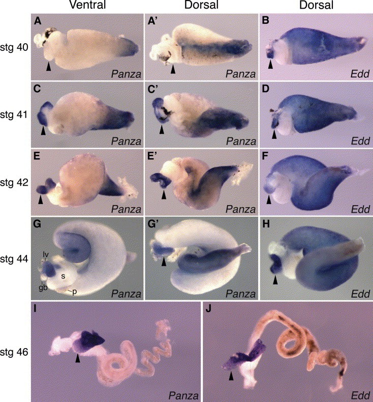 Fig. 4. Panza and Edd expression in the coiled gut and liver. In situ hybridization for Panza (A,Aâ²,C,Câ²,E,Eâ²,G,Gâ²,I) and Edd (B,D,F,H,J) expression in guts removed from embryos at stages 40 (A,Aâ²,B), 41 (C,Câ²,D), 42 (E,Eâ²,F), 44 (G,Gâ²,H), and 46 (I,J). Ventral (A,C,E,G) and dorsal (Aâ²,B,Câ²,D,Eâ²,F,Gâ²,H) views with anteriorleft are shown. For some samples, the coiled gut was straightened before in situ hybridization and is shown with anteriorleft (I,J). The brown material apparent in the coiled gut shown in (J) is gut contents present before sample preparation. Arrowheads indicate the position of the liver. gb, Gallbladder; lv, liver; p, pancreas; s, stomach.