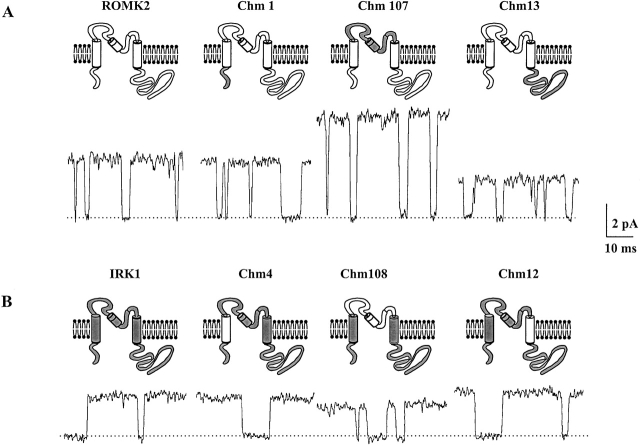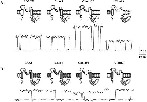 Figure 2. Single-channel current traces of ROMK2, IRK1, and some chimeras at −100 mV in the cell-attached mode. The shaded regions of the rectangles depicting the chimeras are derived from IRK1 and the open regions from ROMK2. The dotted lines indicate the closed state, and upward direction is inward current. The pipette solution contained 110 mM KCl. (A) Conductances of Chm107 and Chm13 are, respectively, larger and smaller than that of ROMK2. (B) Conductance of Chm108 is smaller than that of IRK1. |