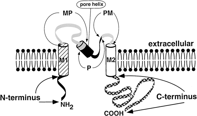 Figure 1. Segmental division of both ROMK and IRK. In each of the four subunits, M1 and M2 are presumed membrane-spanning domains. P denotes the highly conserved (pore) domain. The segments MP and PM are, respectively, the region between M1 and P, and the region between P and M2. The cylinder in the extracellular loop is the pore helix (Doyle et al. 1998), consisting of the first half of the P region with a minor contribution from the MP region. The seven segments of the chimeras are defined in Figure 4 of Choe et al. 1999. |