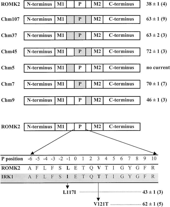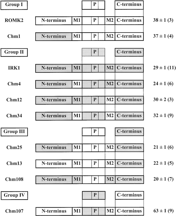 Figure 3. Conductance (pS) at the voltage range of 0–100 mV. Shaded rectangles correspond to segments from IRK1. Clear rectangles denote segments from ROMK2. Data are means ± SEM (number of measurements). |