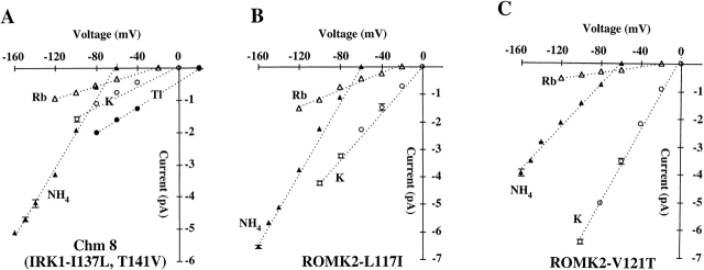 Figure 7. I-V plots for single channel inward currents of Chm8 (ROMK2, L117I, and V121T) and the individual mutants, L117I and V121T, in the cell-attached mode. The symbols and the voltage range for the conductance estimates are the same as in Fig. 6. The correlation coefficients are (in the order of K, NH4, and Rb): for Chm8: 0.994, 0.993, and 0.991; for L117I: 0.997, 0.998, and 0.991; for V121T: 0.997, 0.996, and 0.994. |