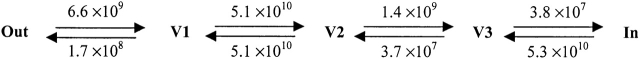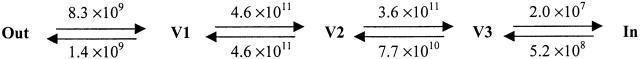 Figure 9. Three-site four-barrier kinetic model. (A, top) Single channel I-V plots for K+ current through ROMK2 channel (110 mM KCl in the pipette in the cell-attached mode). The line is the best-fit to the data using the three-site four-barrier kinetic model, which gives rise to the following rate constants (s−1) (Scheme I). V1, V2, and V3 represent the first, second, and third energy wells from the outside.SCHEME I (Middle) The energy profile for K+ ion along the pore of ROMK2 at 0 mV. The shape of the energy profiles was constructed from the kinetic model. (Bottom) Occupancy plot of each state as a function of voltage for the K+ ion in the pore of ROMK2. The symbol KKK indicates the state that all three energy wells are occupied by K+, and the symbol EKK indicates the state that the second and the third energy wells from outside are occupied by K+. The pore is occupied by at least two K+ ions most of the time. The occupancies of the two states, KKE and EEE, are very small and not shown. (B, top) Single channel I-V plots of ROMK2 with NH4+ (110 mM) outside and K+ (110 mM) inside the cell. The line is the best-fit to the data using the three-site four-barrier kinetic model with the same rate constants as in A for K+. The fitting procedure produced the following kinetic rates for NH4+ (Scheme II).SCHEME II (Middle) The ion energy profile (solid) for NH4+ ion along the pore of ROMK2 at 0 mV, obtained from the kinetic model for NH4+. The dotted energy profile is for K+ in A for comparison. The energy wells for NH4+ are shallower than those for K+, suggesting weaker affinity for NH4+. (Bottom) Occupancy plot of each state as a function of voltage in the pore of ROMK2 with NH4+ outside and K+ inside. The symbol NNN means that all three sites are occupied by NH4+, and the symbol NEK means that the outer and inner wells are occupied by NH4+ and K+, respectively. States with small occupancies are not shown for clarity. |