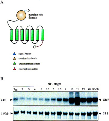 Fig. 1. The Xfz7 transmembrane receptor is expressed in Xenopus embryos. (A) Schematic representation of the predicted Xfz7 structure. The protein contains a putative N-terminal signal peptide, a cysteine-rich domain (CRD) containing 10 cysteine residues, seven transmembrane domains with seven hydrophobic stretches, and a small C-terminal tail of 26 amino acids with a S/T-X-V motif region. Recently, Xfz7 cDNA sequences have been reported in GenBank database by other groups (accession numbers: AJ243323, AF114151 and Wheeler and Hoppler, 1999). (B) Temporal expression of Xfz7 mRNA during Xenopus development. Northern blot analysis was carried out using total RNA from mature oocytes (stage VI) and different embryonic stages (1.5 oocyte/embryo equivalent). The full length Xfz7 cDNA labelled with 32P was used as hybridization probe. A 4-kb Xfz7 transcript is expressed in oocytes and persists during early cleavage stages. Zygotic transcripts peak at stage 11. As loading control, the 18S Ribosomal RNA was stained with ethidium bromide.