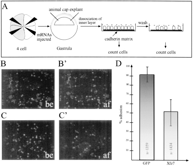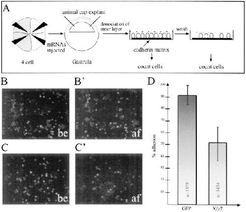 Fig. 6. Xfz7 decreases cadherin-mediated cell adhesion. (A) Schematic representation of the experiment. Four-cell stage embryos were injected with 0.5 ng of Xfz7 mRNA in combination with 0.2 ng EGFP mRNA or with EGFP mRNA alone in the animal hemisphere of each blastomere. At the gastrula stage, animal caps were dissected and the blastomeres of the inner cell layer were dissociated and allowed to attach to spots of CEC1-5 substrate for 1 h. The Petri dish was washed for 5 min and GFP-containing blastomeres were counted before and after the wash. (B,Bâ²) Dissociated blastomeres overexpressing EGFP, (C,Câ²) Xfz7 and EGFP, attached to the CEC1-5 matrix before (be) or after (af) the wash. (D) Quantitation of the decrease in cell adhesion after overexpression of Xfz7. Compilation of data from five independent experiments; number of counted cells per experiment was between 200 and 300. Error bars indicate standard deviation.
