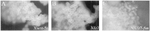 Fig. 8. Overexpression of Xfz7 triggers the localization of GFP-PKC to the membrane. (A) Embryos were injected into the animal pole with 0.4 ng GFP-PKC mRNA together with 0.05 ng of Xwnt-5a or (B) 0.25 ng Xfz7 or (C) 0.25 ng NXfz7-fun mRNA. At stage 10 the animal caps were explanted, fixed and the localization of the GFP fluorescence was determined. Membrane staining was observed in 77% (n=26) of the caps injected with Xwnt-5a and in 68% (n=38) of the caps expressing Xfz7 but only 11% (n=18) of the explants expressing NXfz7-fun displayed weak PKC membrane staining.