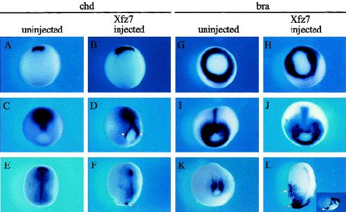 Fig. 4. Xfz7 changes the pattern of chordin and Xbra. Albino embryos at the four-cell stage were injected in the marginal region of all blastomeres with 0.5 ng of Xfz7 mRNA. (A,C,E) Expression of chd in uninjected and (B,D,F) Xfz7-injected embryos was examined at stage 10.5, 12 and 18 by whole-mount in situ hybridization. The early pattern of chd is unchanged in injected embryos (A,B). Toward the end of gastrulation, chd-positive cells do not converge to the dorsal midline (C,D) and stay at the site of the closing blastopore (E,F), indicated by arrows. (G,I,K) Expression of Xbra in uninjected and (H,J,L) Xfz7-injected embryos was examined at stage 10.5, 12 and 18. (L) Small inserted picture. Note the ectopic Xbra expression in Xfz7-injected embryos on ventral and lateral sides (arrows).