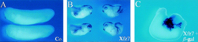 Fig. 3. Overexpression of Xfz7 perturbs trunk and tail formation. (A) Normal uninjected tadpoles (NF-stage 35). (B) Embryos injected unilaterally with 0.2 ng of Xfz7 mRNA in the lateral marginal zone at the eight-cell stage, display reduced tail structures and kinked trunks (45%, n=15/33). (C) In embryos injected bilaterally at the four-cell stage in the dorsal marginal zone with 0.5 ng of Xfz7 mRNA and 0.1 ng of β-gal mRNA as a lineage tracer, the injected cells are not distributed along the axis but stay together as a clump (80%, n=44/55).