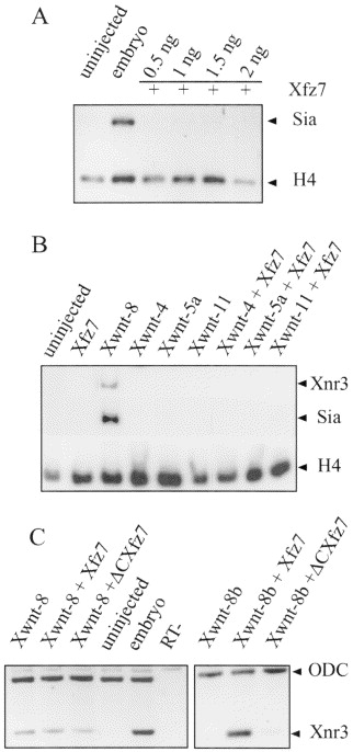 Fig. 7. Interaction of Xfz7 with Wnt-1 and Wnt-5a-type ligands. (A) Increasing amounts of Xfz7 mRNA (0.5â2 ng) were injected into animal blastomeres. Animal caps were explanted at stage 8.5 and cultured until stage 10. Expression of the dorsal marker siamois was assayed by RTâPCR. (B) Synthetic Xwnt-5a type-ligands (0.02 ng) (Xwnt-4, Xwnt-5 and Xwnt-11 mRNAs) alone or in combination with 0.5 ng of Xfz7 mRNA were injected into two animal blastomeres. Animal caps were explanted at stage 8.5 and cultured until stage 10 and expression of sia and Xnr-3 was analyzed by RTâPCR. Xwnt-8 mRNA (0.02 ng) alone but not Xwnt-5a-type ligands in combination with Xfz7 induced Xnr-3 and sia expression. (C) Xwnt-8b acts synergistically with Xfz7 to trigger the Wnt-1 pathway. Synthetic Xwnt-8 mRNA (0.02 ng), Xwnt-8b mRNA (0.02â0.1 ng) alone or in combination with 0.5 ng of Xfz7 or 0.5 ng of δCXfz7 mRNAs were microinjected into two animal blastomeres at the four-cell stage. Animal explants were dissected and analyzed for Xnr-3 expression by RTâPCR.
