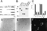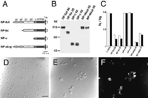 Figure 1. Cell adhesion activity of transfectants which express mutant neuropilin-1 proteins (Part 1). (A) A schematic representation of mutant neuropilin-1s. NP-full, intact neuropilin-1; NP-bc, neuropilin-1 lacking the a1 and a2 domains; NP-c, neuropilin-1 protein lacking the a1, a2, b1, and b2 domains; NP-abcp, neuropilin-1 whose transmembrane and cytoplasmic regions are replaced by that of the Xenopus plexin. (B) Immunoblot of transfectants expressing intact and mutant neuropilin-1 proteins, by using an antibody raised against the b1-c domains. The number followed by the name of the construct represents the clone number. (C) Quantification of cell aggregation activity of the mutant neuropilin-1s. The degree of aggregation of transfectants is expressed by the index Nt/N0, where Nt and N0 are the total particle number at incubation times t and 0, respectively. White and black bars represent N30/N0 and N60/N0, respectively. (D–F) Cell aggregation at 60 min in gyration, detected by phase contrast (D and E) or fluorescence microscope (F). Parental L cells do not show cell aggregability (D). In contrast, fluorescein-labeled parental L cells and transfectants expressing NP-full 86 form mixed cell aggregates (E and F). E and F show the same field. Bar, 100 μm.