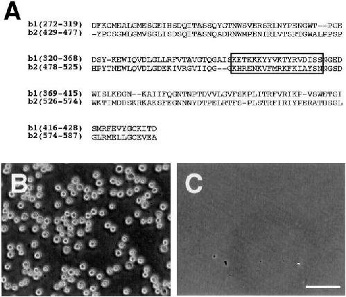 Figure 5. Determination of cell adhesion sites in the b1 domain. (A) Amino acid alignment of the b1 and b2 domains. Shaded boxes indicate consensus sequences. An open box indicates the cell adhesion sites in the b2 domain and its homologous region (347–364 aa) in the b1 domain. (B and C) Cell adhesion activity of the GST-tagged b1(347–364) recombinant protein [GST-b1(347–364)]. L cells (B) but not trypsin-treated L cells (C) adhere to the immobilized GST-b1(347–364). Bar, 100 μm.