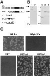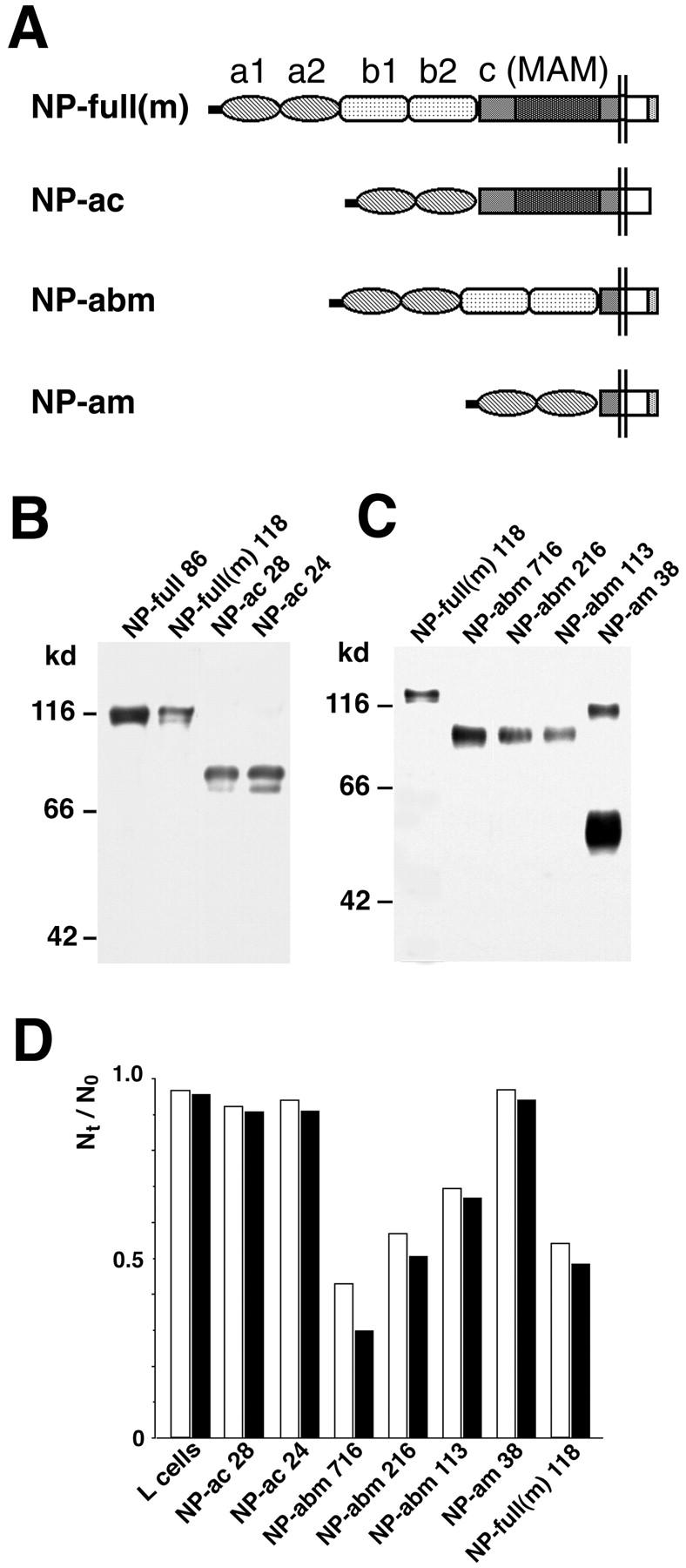 Figure 2. Cell adhesion activity of transfectants which express mutant neuropilin-1 proteins (Part 2). (A) A schematic representation of mutant neuropilin-1s; NP-full(m), full-length neuropilin-1 containing myc tag at the COOH-terminal end; NP-ac, neuropilin-1 lacking the b1 and b2 domains; NP-abm, neuropilin-1 lacking the c domain (myc-tagged); NP-am, neuropilin-1 lacking the b1, b2, and c domains (myc-tagged). (B and C) Immunoblot of the transfectants with the antibody raised against the b1-c domains (B) and anti-myc antibody (C). The number followed by the name of the construct represents the clone number. A band at the 100-kD position in the lane of NP-am appears to be dimerized proteins. (D) Quantification of cell aggregation activity of the mutant neuropilin-1s. White and black bars represent N30/N0 and N60/N0, respectively.