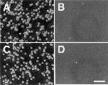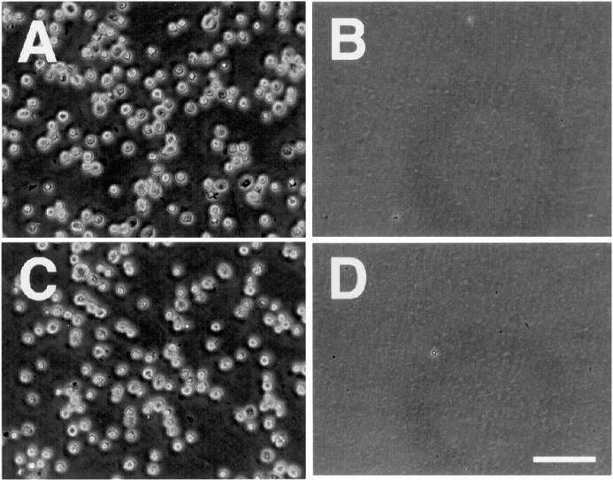 Figure 6. Adhesion of embryonic mesenchymal cells to the recombinant proteins for the cell adhesion sites of neuropilin-1. Trunk mesenchymal cells from E13 mouse embryos adhere to the immobilized GST-b1(347–364) (A and B) and GST-b2(504–521) (C and D) recombinant proteins. Trypsin-treated mesenchymal cells do not adhere to the recombinant proteins (B and D). Bar, 100 μm.