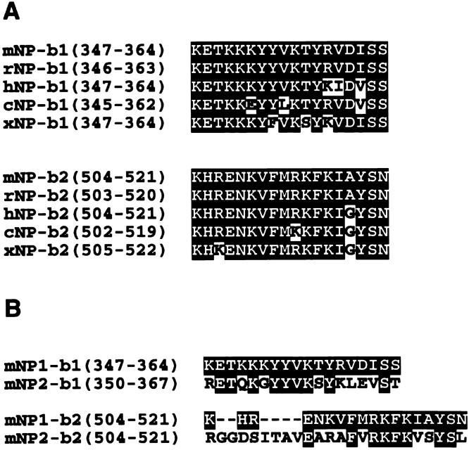 Figure 9. Comparison of amino acid sequences in cell adhesion sites among vertebrate neuropilin-1s (A) or the mouse neuropilin family (B). The amino acid sequences in the cell adhesion sites are highly conserved among the mouse (mNP), rat (rNP), human (hNP), chicken (cNP), and Xenopus (xNP) neuropilin-1s. On the other hand, only about half of the amino acid residues of the cell adhesion site of mouse neuropilin-1 and of mouse neuropilin-2 are identical.