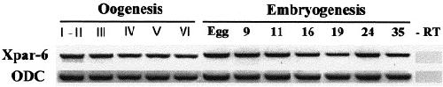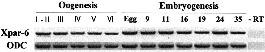 Fig. 2. RTâPCR analysis during development (stages indicated above the lanes) shows maternal and zygotic Xpar-6 transcription. ODC serves as a loading control and the âRT lane is a control of RTâPCR on stage 35 whole embryo RNA in the absence of reverse transcriptase.