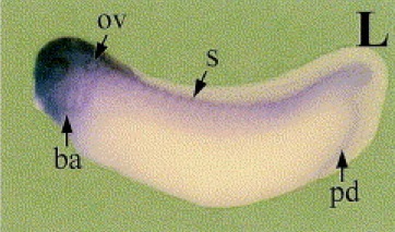 Fig. 3. Spatiotemporal expression pattern of Xpar-6 assayed by whole-mount in situ hybridization. (A) Lateral view of an egg showing enhanced signal in the animal region, with animal pole at top. (B) Sense probe control â egg. (C) The pattern in A was confirmed by RTâPCR analysis of Xpar-6 in animal cap (AC) and vegetal pole (VP) explants from fertilized eggs. EF-1a was used as a loading control. (D,E) A stage 11 embryo viewed, ventrally and dorsally, respectively, with anterior at top. Arrowheads indicate yolk plug. (F) Vegetal view of a stage 11 embryo shows moderate staining of Xpar-6 in a yolk plug, with dorsal side at top. An arrow indicates dorsal lip of blastopore. (G) Dorsal and (H) anteroventral views, with anterior at top, of an early neurula showing Xpar-6 transcripts localized to the dorsolateral region and anterior end of the presumptive neural area. (I) Anterolateral and (J) anterodorsal views, with anterior to the left, of mid-neurula stage embryos. Xpar-6 is expressed in the lateral region along the ridges of neural fold and extreme anterior region surrounding the anterior edge of the neural plate. Bilaterally symmetric pattern of Xpar-6 expression is also observed in patches (arrowheads) in the anterior region of the neural plate. (K) Side view, with anterior to the left, of a late neurula stage embryo. (L) A late tailbudembryo viewed laterally. Xpar-6 expression is intense in the head, labeling the eyes, branchial arches, otic vesicles and brain. Posterior to the head, Xpar-6 is expressed in the somites, pronephros, tail tip and proctodeum. ov, otic vesicle; s, somite; ba, branchial arches; pd, proctodeum.