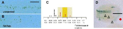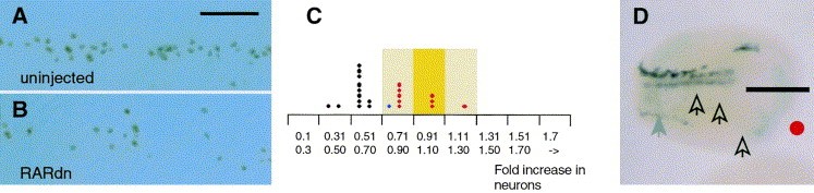 Fig. 3. Depressed retinoid signalling decreases the number of Isl1+ primary sensory neurons. (A,B). (A) Isl1 expression in the primary sensory neuron domain of a normal embryo. (B) Embryos injected with RARdn mRNA have a reduced number of Isl1+ primary sensory neurons. In this example the width of the domain is wider in the RARdn injected embryos than normal. Scale bar applies to (A) and (B) and is equal to 60 μm. (C) Analysis of the effect of unilaterally injecting the xRARα2dn mRNA on the ratio of Isl1+ primary sensory neurons on the injected compared to the uninjected sides of the embryo. The yellow background indicates the peak and distribution range of Isl-1+ primary sensory neurons in normal embryos (shown in Fig. 2D). Blue dots indicate embryos injected with 1.0 ng and red dots embryos injected with 0.5ng RARdn mRNA. In contrast to Fig. 2D there is now a shift towards reduced numbers of Isl1+ primary sensory neurons on the injected side of the embryo. (D) NST expression assayed by wholemount in-situ hybridization in an embryo unilaterally injected with RARdn mRNA. The injected side is marked with a red dot and the midline by a bar. The expression of NST in the motor, and inter neuron domains is undetectable, and is also missing from the trigeminal ganglion domain (open arrows). Expression in the sensory neuron domain is detectable (grey arrow) but much weaker than on the control side of the embryo.