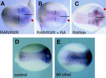 Fig. 5. The level of retinoid signalling in the embryo does not affect the lateral extent of the neurectoderm. (AâC). sox-2 expression in embryos unilaterally injected with: (A) RAR/RXR, (B) RAR/RXR with the addition of RA and (C) RARdn mRNA. The injected side is marked by a red dot, the midline by a horizontal bar and the lateral extent of the neurectoderm by vertical bars. Although the morphology of the neural plate, particularly in the anteriorneurectoderm is altered in embryos treated with RA (B), the lateral extent of sox-2 expression is unaltered compared to the control sides in each of the manipulations. (D,E) The expression of sox-2 in normal (D) and citral-treated (E) neurula stage embryos. Although the citral treated embryos show morphological changes compared to the normal controls, the expression of sox-2 was unaffected. This suggests that although treatment with citral inhibits the primary neurogenesis it is not doing so by eliminating the formation of the neurectoderm.