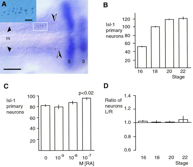 A quantitative analysis of Isl1+ primary sensory neurons in the Xenopus embryo. In all figures, embryos are shown with anterior to the right. (A). The Xenopus embryo expresses Isl1 in columns either side of the midline (m) predominantly in primary sensory neurons (black arrowheads). The Isl1+ primary sensory neurons (enlarged in insert) are found at equal density along the length of the posteriorneurectoderm. The anterior border for Isl1+ primary sensory neurons (black and white arrowheads) is a short distance caudal to rhombomere 5 shown by double labelling with the rhombomere marker krox-20 which identifies rhombomeres 3 and 5 (marked on the figure). Scale bars: main image 120 μm, inset 20 μm. (B). Time course of formation of Isl1+ primary sensory neurons. The mean number of Isl1+ primary sensory neurons per side of an embryo was determined for more than 10 embryos at each developmental stage. The bars represent the standard error of this calculation. At stage 22 there was a mean of 120 Isl1+ primary sensory neurons on each side of the embryo. (C). The effect of applied RA on the numbers of Isl1+ primary sensory neurons. The mean number of Isl1+ primary sensory neurons for one side of an embryo was calculated for at least ten embryos at stage 17 over a range of applied RA concentrations, bars represent the standard error of the calculation. In untreated embryos there was a mean of 82 (SE 3.5) and in embryos grown from the late blastula stage in 10â7 M RA there was a mean of 95 (SE 3.0) Isl1+ primary sensory neurons. (D). There is no asymmetry in the formation of Isl1+ primary sensory neurons. The ratio of the number of Isl1+ primary sensory neurons on the left compared to the right side of the embryo was determined from mid to late neurula stages for more than 8 embryos at each stage. There was no significant difference in the number of neurons on one side compared to the other.