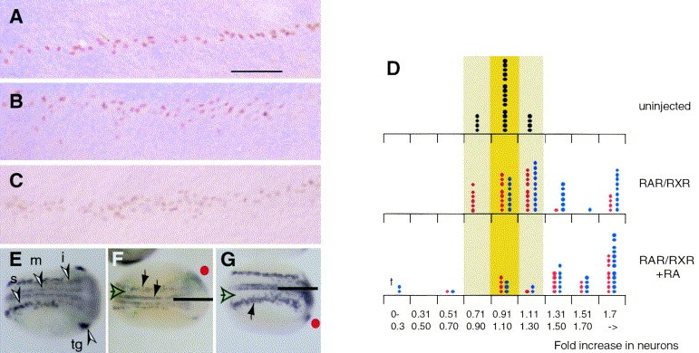 Fig. 2. Elevated retinoid signalling increases the number of primary sensory neurons. (AâC). Isl1+ primary sensory neurons at stage 20 in (A) control, (B) RAR/RXR mRNA injected and (C) RAR/RXR mRNA injected + RA treated embryos. The number of neurons increases in embryos subjected to elevated retinoid signalling though the neurons are still found in restricted, if widened, domains and are not dispersed throughout the neurectoderm. Scale bar applies to each panel AâC and represents 60 μm. (D). The ratio of Isl1+ primary sensory neurons on the left compared to the right side of the embryo was calculated for uninjected controls (top panel). Each dot represents an individual embryo. The peak (dark yellow) and distribution ranges (light yellow) of the ratio of Isl1+ primary sensory neurons are indicated. Isl1+ primary sensory neurons were then counted in embryos unilaterally injected with RAR/RXR (middle panel) and RAR/RXR with 10â7 M RA (lower panel). The blue dots represent individual embryos injected with 250â500 pg and red dots individuals with 62-125pg of RNA. Following injection of 250â500 pg of RAR/RXR mRNA most individuals have increased numbers of Isl1+ primary sensory neurons on the injected side. Following RA treatment a larger proportion of embryos have increased numbers of Isl1+ primary sensory neurons on the injected side. In a small number of cases (marked with a â symbol) there is a significant decrease in the number of Isl1+ primary sensory neurons on the injected side of embryos receiving 250â500 pg of RNA. In these cases it appeared as if gastrulation was compromized on the injected side of the embryo. (EâG) Neural specific tubulin expression assayed by wholemount in situ hybridization in (E), control, (F), RAR/RXR mRNA injected and (G), RAR/RXR mRNA injected + RA treated embryos. The three domains of primary neurons either side of the midline are marked in (E), s, sensory, i, inter and m, motor neurons. The expression of NST in the trigeminal ganglion is also marked (tg). (F) the injected side is marked with a red dot and the horizontal bar marks the midline. There is increased NST expression in the sensory neuron and motor neuron domains (black arrows) compared to the uninjected side. However, these domains remain separated by a region of neurectderm that does not express NST (open arrow). (G). Increased NST expression is seen on the injected side of the embryo grown in 10â7 M RA but still does not extend significantly into the non-neural ectoderm or into the region of the neurectoderm between sensory and motor neuron domains (open arrow).