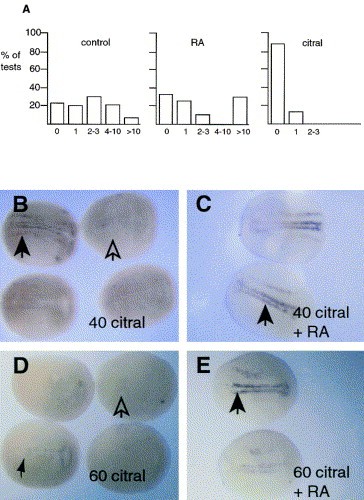 Fig. 4. Citral, an inhibitor of retinoic acid synthesis, inhibits the formation of primary neurons. (A) Functional assay of embryo movement at the tailbud stage in response to external stimulation. Embryos were grown from the late blastula stage to the early neurula stage in control (0.1à MBS), 10â7 M RA or 60μM citral and then in normal media to the tailbud stage (stage 28). Samples of 25 embryos were then analysed by lightly touching the embryo with a fine needle adjacent, but posterior, to the otic vesicle. The number of tailflips was then counted. Each batch of embryos was stimulated 50 times. Whereas control and RA treated embryos displayed a range of responses to stimulation, the citral treated embryos gave only the an occasional and short response. (BâD). NST expression in embryos treated with citral or citral plus RA. (B), embryos grown from the late blastula to early neurula stage in 40 μM citral show NST expression that is essentially normal (black arrow) in some, but decreased NST expression (open arrow) in other individuals. (C), The addition of 10â7 M RA at the late blastula stage to embryos grown in 40 μM citral results in the recovery of NST expression (black arrow). (D). Embryos grown in 60 μM citral have little or no NST expression (open arrow) though it is sometimes possible to distinguish weak NST expression (small black arrow). The addition of 10â7 M RA to these embryos results in the widespread rescue of NST expression (black arrow).