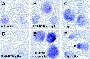 Fig. 6. Retinoid signalling promotes the formation of primary neurons in neuralized animal caps. Animal caps were taken from control and experimental embryos injected with either noggin or RAR/RXR mRNA or a combination of these RNAs and grown from the late blastula stage in the presence or absence of 10â7 M RA. The animal caps were assayed at the equivalent of the late neurula stage for the expression of the primary neuron marker, NST. Widespread punctate expression of NST was seen only in animal caps injected with noggin and RAR/RXR mRNA and treated with RA (E). Both non-neuralized animal caps with elevated retinoid signalling (D) and neuralized animal caps with RAR/RXR but no ligand showed no NST expression. The addition of RA to noggin-neuralized animal caps (F) consistently showed a small amount of NST expression clustered to one end of the animal cap (arrowhead). This may reflect the observation that animal caps are heterogeneous and respond to neural induction more strongly on the dorsal side (Sharpe et al., 1987).