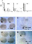 Fig. 7. Elevated retinoid signalling in the ectodermal component of neural-inducing conjugates results in the increased expression of the primary neuron marker, NST. (AâC) NST expression in conjugates of animal cap ectoderm and dorsolateral mesoderm, grown in 10â7 M RA and assayed at the late neurula stage for the expression of NST. The component injected with RAR/RXR mRNA is indicated in green print. Expression of NST is increased (black arrows) in area in conjugates that received RAR/RXR in the animal cap component (C) compared to controls (A). Conjugates with additional RAR/RXR transcripts in the mesoderm (B) showed less and reduced NST expression possibly because the retinoid signalling ventralizes the mesoderm (Ruiz i Altaba and Jessell, 1991) and makes it a poorer neural inducer. (D,E). A section through one of the conjugates shown in (C) seen under normal (D) and uv (E) light to correlate NST expression (blue patches indicated by arrows) in (D) with the animal cap ectodermal component of the conjugate (green fluorescence) in (E).