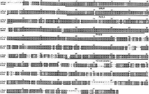 Fig. 1. Amino acid sequence comparison of the CLOCK proteins from Xenopus and mouse. The deduced amino acid sequence of the Xenopus CLOCK protein was aligned with the mouse sequence using the ClusalW algorithm. Identical amino acids are highlighted in dark gray and similar amino acids (conservative changes) are highlighted in light gray. Introduced gaps are shown as dashes (- - -). The regions corresponding to the bHLH, PAS A and PAS B domains are underlined and labeled. The positions of the known Clock mutations are also marked, including the location of the deletion found in the mouse Clock mutant (underlined and labeled) [23]and the position of the stop codon in the Drosophila Clock mutant jrk (asterisk at N608) [1].