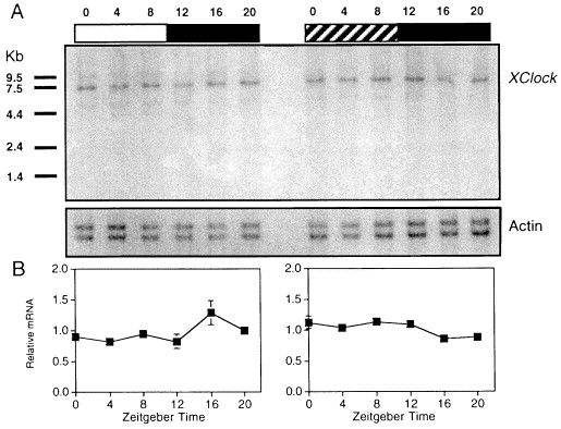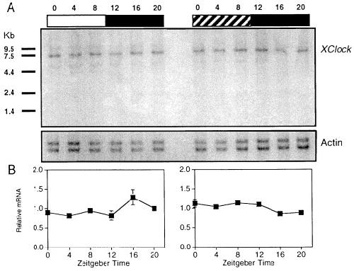 Fig. 3. Temporal analysis of Clock mRNA expression in Xenopus retina. RNA was isolated from Xenopus retinas collected at 4-h intervals throughout the day from eyecups cultured in either 12L:12D light:dark cycles or in constant darkness. (A) Northern blot analysis of Clock mRNA levels. Each lane contains about 3 μg of total RNA. The times (ZT) of collection for each sample are shown above the blot. The bars above the blot indicate the lighting conditions at the time of harvest: black bars represent night (dark), white bars represent light during the day, and hatched bars represent dark during the day (subjective day). The blot shown is representative of three independent experiments. In each case, the filter was stripped and reprobed with a chicken β-actin probe [11]for normalization. The position of RNA size standards are indicated. (B) Quantitation of Clock mRNA levels at 4-h intervals in light:dark cycles (left) or in constant dark (right). The graphs show the mean relative Clock mRNA levels from three independent Northern blots, including the one shown in (A). Error bars indicate the S.E.M. and are too small to visualize for some of the points.