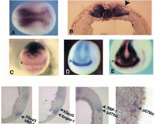 Fig. 5. p27XIC1 is normally expressed in non-dividing cells. Expression of XBF-1 in the anterior neural plate coincides with the expression of XSox3, but not that of p27XIC1. Neural plate-stage embryos were analysed for the expression of p27XIC1 (A-C). The sectioned embryo (B) was also labelled for BrdU incorporation (brown nuclear staining). p27XIC1 is expressed in non-BrdU incorporating cells both in the mesoderm and in the neural ectoderm (B, arrow). In the anterior neural plate (C), p27XIC1 was expressed in a band in a similar region to that of XBF-1 (D) and XSox3 (D,E) (marked by asterisks; D, XBF-1 in purple and XSox3 in light blue and E, XSox3 only in purple/brown). (Lower panels) Sections of double in situ hybridisations in light blue and purple, showing that XSox3 and XBF-1 are largely coexpressed and that p27XIC1 is expressed more rostrally than XBF-1 in a more comparable region to that of neurogenin, X-ngnr-1. p27XIC1 was expressed in BrdU negative cells in the anterior neural plate (bottom right panel). |