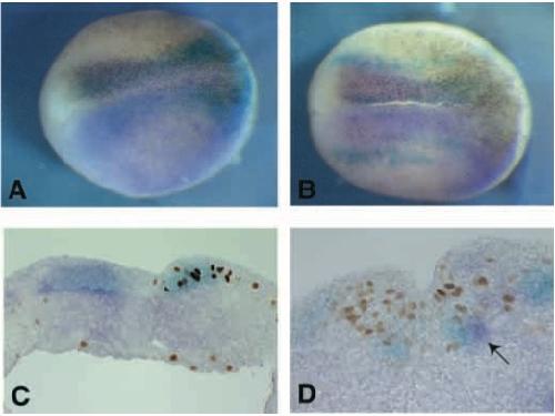 Fig. 8. p27XIC1 misexpression does not alter the pattern of expression of N-tubulin or XSox3. p27XIC1 misexpression has no effect in inducing ectopic XSox3 (A,C) or N-tubulin (B,D) expression. Embryos were injected with p27XIC1 RNA and were analysed for p27XIC1 (magenta), XSox3 (light blue, A,C) and N-tubulin expression (light blue, B,D) and for BrdU incorporation (brown nuclei). Magenta colour shows primarily the ectopic p27XIC1 expression although some endogenous expression can be seen in B. Cells expressing p27XIC1 did not incorporate BrdU; however cells in the neural plate that were expressing injected p27XIC1 still expressed XSox3, excluding the possibility of non-specific toxic effects of p27XIC1. Arrow in D, shows a cell within the neural plate that has received p27XIC1 RNA but does not express N-tubulin. |