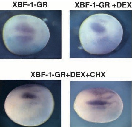 Fig. 9. p27XIC1 is a direct target of XBF-1. Dexamethasone-inducible XBF-1 RNA suppresses p27XIC1 in the presence (bottom panels) and absence (top right) of the protein synthesis inhibitor, cycloheximide. In the absence of both dexamethasone and cycloheximide, XBF-1- GR did not suppress p27XIC1 expression (top left panel). |