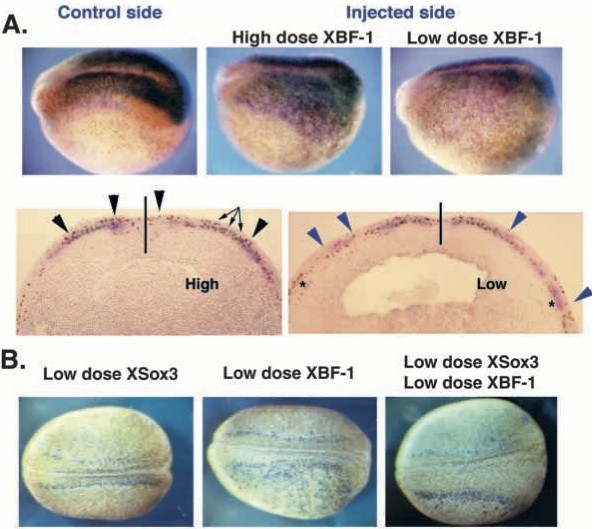 Fig. 4. XBF-1 affects BrdU incorporation in the ectoderm and co-operates with XSox3. (A) Embryos were injected with either a high or a low dose of XBF-1 RNA, as indicated, in one blastomere of the two-cell stage embryo and were processed for double whole-mount in situ hybridisation for XSox3 (blue/green) and N-tubulin (magenta), followed by BrdU incorporation (brown). Whole mounts and transverse section are shown. In the sections a black line indicates the dorsal midline, separating the injected (right) from the uninjected side (left). Black and blue arrowheads delimit the XSox3 and N-tubulin expression domains, respectively. In the high-dose sections, arrows show an area of increased BrdU incorporation on the injected side. In the low-dose sections, an asterisk on the injected side (right) shows an area of the ectoderm where dividing cells should have been located, when compared with the equivalent region of the control side (asterisk on control side, left). Also note that in the control side N-tubulin positive cells are located within a wider area of BrdU negative cells while in the experimental side N- tubulin positive and BrdU positive cells are intermingled. (B) Embryos were injected with either low-dose XSox3, low- dose XBF-1, or both, and processed for N-tubulin (purple) and BrdU incorporation (brown). A low dose of XSox3 did not affect the expression of N-tubulin, whereas low-dose XBF-1 induced additional ectopic N-tubulin positive cells. Coinjection of both low-dose XSox3 and low-dose XBF-1 suppressed endogenous and induced ectopic N-tubulin, in the same way that a high-dose XBF-1 affects N-tubulin expression (see also Table 1). |