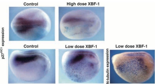 Fig. 7. XBF-1 regulates p27XIC1 in a dose-dependent manner. Embryos were injected with either a high or a low dose of XBF-1 RNA and analysed for expression of p27XIC1 or N-tubulin. A high dose of XBF-1 suppressed p27XIC1 and repositioned residual p27XIC1 expression laterally (top right panel, dorsal view) while a low dose induced ectopic p27XIC1 in the lateral ectoderm (bottom middle panel, side view), in the same way that a low dose of XBF-1 induces ectopic N-tubulin (shown for comparison in bottom right panel). XBF-1 RNA was coinjected with lacZ RNA as a lineage marker; embryos injected with lacZ alone were normal (left panels). |