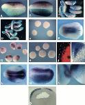 Fig. 1. XBF-1 induces neural tissue autonomously, at the expense of epidermis and in the absence of mesodermal signals. XBF-1 induces ectopic XSox3 even when cell division is blocked. Embryos were injected with a high dose of XBF-1 plus lacZ RNA or lacZ RNA alone (A or B respectively; light blue) and hybridised with a probe for epidermal keratin (dark magenta). Other embryos (C,D) were injected with XBF-1 plus lacZ RNA and were analysed at the tadpole stage for lacZ (C,D; light blue), N-tubulin (C) and muscle actin (D) expression (magenta). Note that ectopic N-tubulin expression is not accompanied by a corresponding expansion or ectopic expression of muscle actin. XBF-1 injected animal caps do not express collagen type II (E), which in the embryo is expressed in the somites and notochord (F). In contrast, XBF-1 injected (G), but not control uninjected (H), animal caps express XSox3. In this experiment, XBF-1 injected animal caps were combined with control RLDx labelled caps (E,G,H,J). Fluorescent (J) and bright-field (K) images of a sectioned animal cap demonstrate that XSox3 expression is localised in the XBF-1 injected part of the XBF-1/RLDx animal cap conjugate. Embryos (L,M) were injected with a high dose of XBF-1 and lacZ RNA and some of these were treated with HUA at the early gastrula stage (M). All embryos shown (L-N) are hybridised with XSox3. Embryos injected with lacZ and treated with HUA have normal XSox3 expression while both XBF-1 injected (L) and XBF-1 injected plus HUA (M) treated embryos show an expansion of the XSox3 expression domain. The expansion of the XSox-3 expressing domain in HUA- treated XBF-1 injected embryos can be clearly seen in section (O). HUA treated embryos (N, embryo on the right) have larger nuclei than sibling controls (N, embryo on the left) illustrating that cell division has been effectively blocked by the HUA treatment. |