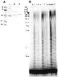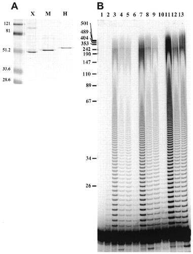 Figure 2. All three vertebrate pol γB subunits stimulate processive DNA synthesis by human pol γA. (A) Coomassie blue stained SDS gel showing recombinant Xenopus (X), mouse (M) and human (H) pol γB subunits. 4.7 pmol of each protein was loaded on the gel, corresponding to ~230 ng of each polypeptide. The sizes in kDa of molecular mass markers run in parallel are indicated on the left. (B) Primer extension assay on oligo(dT)-primed poly(dA). Reactions were carried out as described in Materials and Methods using 40 fmol of pol γA and 240 fmol of pol γB per reaction. Lane 1, no protein; lanes 2–5 correspond to reactions carried out with pol γA alone, A + Xenopus B, A + mouse B and A + human B, respectively, incubated for 1 min; lanes 6–9 are as 2–5 but incubated for 2 min; lanes 10–13 correspond to reactions incubated for 5 min. The sizes in nucleotides of MspI restriction fragments of pUC 18 are indicated on the left.