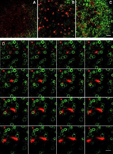 Figure 5. Accumulation of acridine orange, a marker for endosomes and lysosomes, in motile vesicles. Cell-free reactions (without rhodamine-actin) were monitored by phase contrast and fluorescence microscopy in the presence of 20 μg/ml acridine orange. A gallery of merged images (phase contrast and Texas red filter set) from three experiments is presented. 80% of the vesicles associated with comet tails strongly accumulated acridine orange (n = 417 comet tails). Bar, 10 μm.