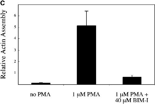 Figure 3. Reconstitution of PMA-stimulated actin assembly in vitro. (A) Time-lapse sequences showing actin comet tails in Xenopus egg extracts. Cytosol was supplemented with a crude membrane fraction, rhodamine-actin, and 1 μM PMA. After incubating at room temperature for 20 min, samples were viewed by fluorescence (left) or phase contrast (right; note higher magnification) microscopy. Arrowheads (left) indicate a moving comet tail. Arrow (bottom right) indicates a phase dense particle at the tip of the comet tail. (B) In vitro actin assembly reactions as in (A) performed in the presence or absence of the PKC inhibitor, BIM-I (40 μM). Fluorescence images from a control reaction without PMA are also presented. Low magnification (20× objective) images were acquired from ten random fields, two of which are depicted for each condition. (C) Quantitation of data presented in B. The total number of pixels with fluorescence intensities above the background were summed over 10 random fields. Data (mean ± SD) from three experiments are presented. Bars: (A) 10 μm; (B) 20 μm.