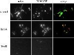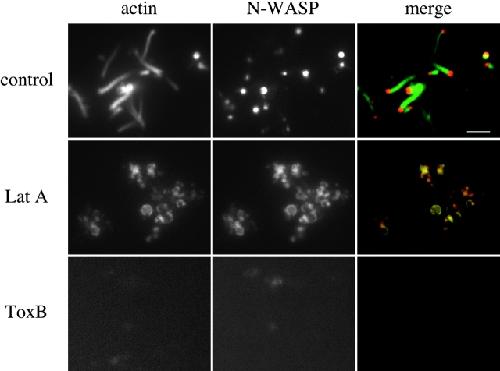 Figure 4. PMA stimulates the recruitment of N-WASP to vesicles associated with actin comet tails. Cell-free vesicle motility assays containing Xenopus cytosol, membranes, and 1 μM PMA were fixed in perfusion chambers and immunolabeled with affinity-purified anti–N-WASP antibodies followed by Texas red secondary antibodies and FITC-phalloidin. N-WASP and F-actin recruitment occurred in the presence of 75 μM latrunculin A, but comet tails were not observed. ToxB treatment prevented both N-WASP and F-actin recruitment, although nonspecific labeling of fixed membranes could be observed with long exposure times. Bar, 5 μm.