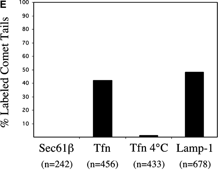 Figure 8. Endosomes and lysosomes preferentially nucleate actin assembly and move in vitro. HeLa postnuclear supernatants were prepared identically from unlabeled cells (A and D) and cells that had been treated with Texas red transferrin at 37°C (B) or 4°C (C). Cell-free motility reactions were fixed and processed for epifluorescence detection of organelle markers (red). F-actin (green, A–D) was detected with FITC-phalloidin. (A) ER membranes were immunodetected with affinity-purified anti-Sec61β antibodies followed by Texas red secondary antibodies. (B) Early and recycling endosomes were detected by labeling cells with Texas red transferrin for 20 min at 37°C. (C) Plasma membranes were detected by labeling cells with Texas red transferrin for 20 min at 4°C. (D) Lysosomes were immunodetected with anti–Lamp-1 H4A3 mAb followed by Texas red secondary antibodies. Bar, 5 μm. (E) Quantitation of comet tails associated with a labeled vesicle in the experiments described in A–D. The n value refers to the total number of actin comet tails counted under each condition from 8–10 random fields.