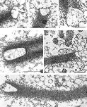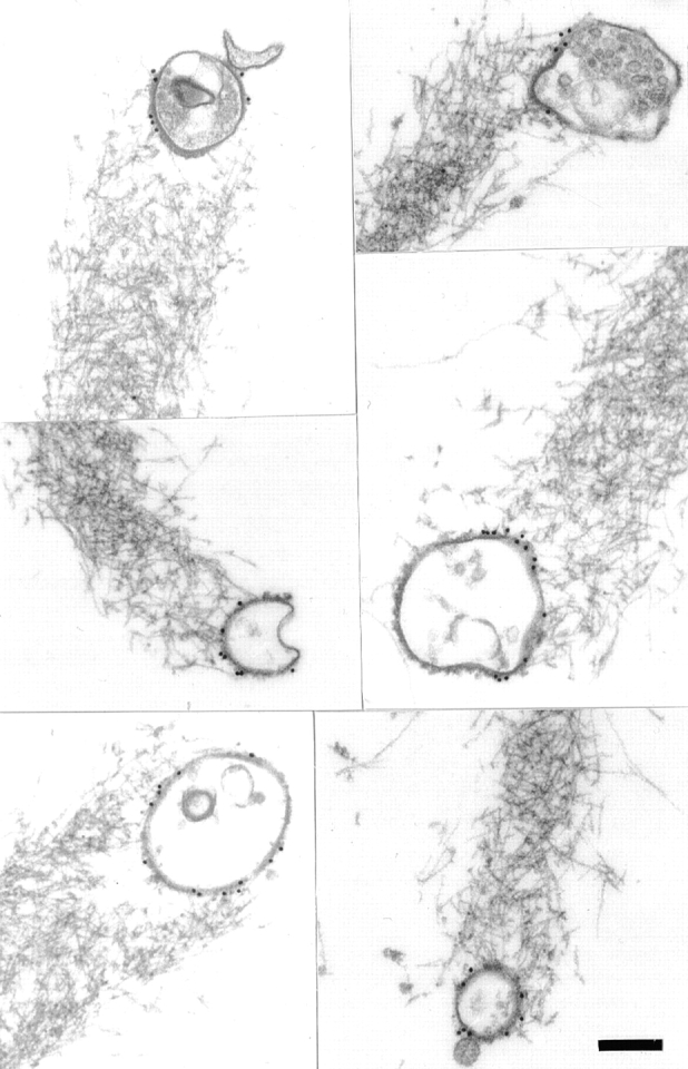 Figure 9. Gallery of electron micrographs depicting N-WASP immunogold-labeled HeLa vesicles associated with actin comet tails. Cell-free motility reactions containing unlabeled HeLa membranes were fixed in perfusion chambers, immunolabeled with affinity-purified N-WASP antibodies followed by 15 nm protein A–gold, and processed for electron microscopy. Gold particles are occasionally visible in the comet tails, but the vast majority are associated with the membrane. Note the similarity in vesicle morphology to the Xenopus egg vesicles shown in Fig. 6. Bar, 200 nm.