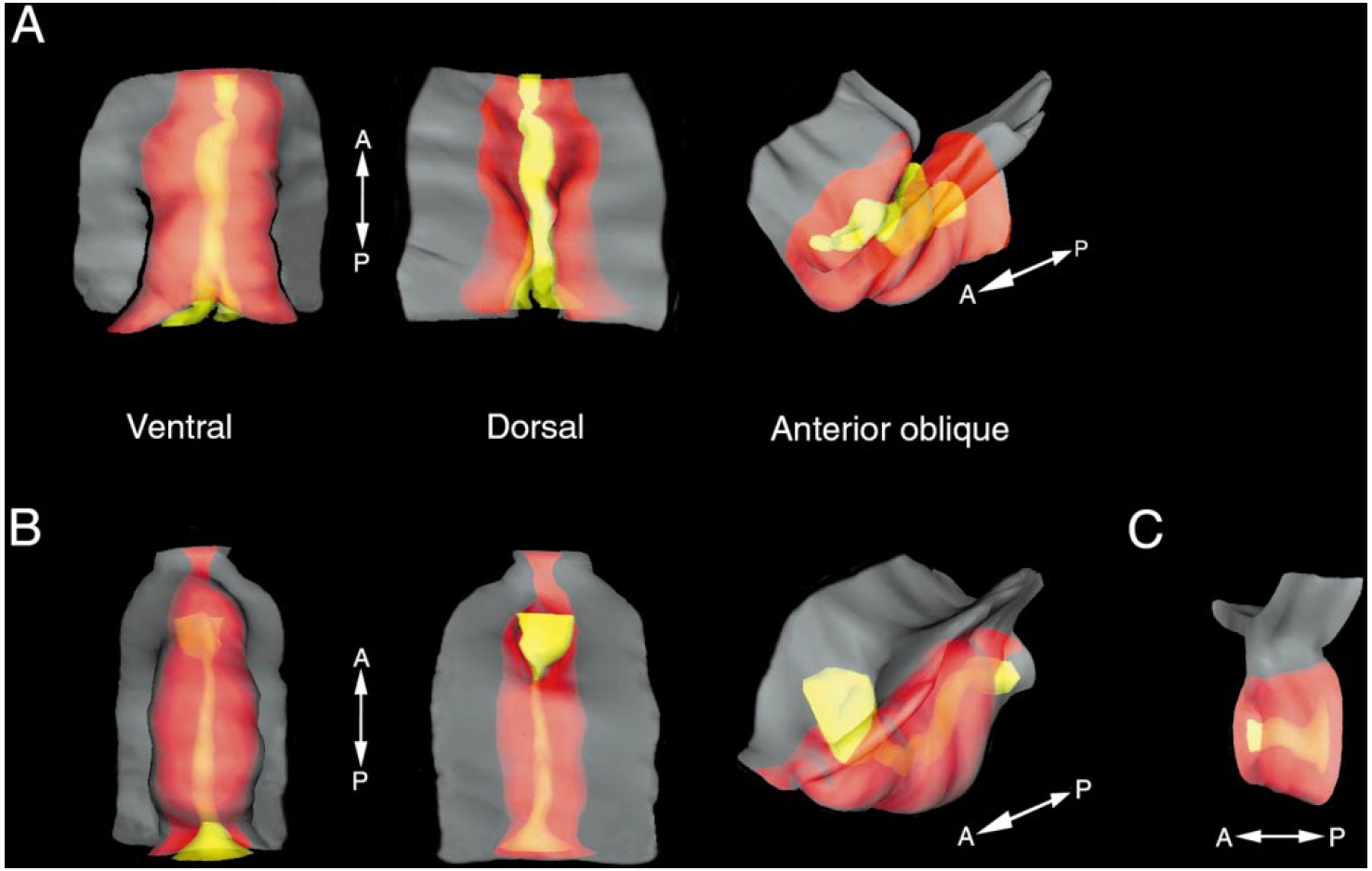 FIG. 2. 3D models of linear heart tube formation. 3D models showing the expression domains for XNkx2.5 (gray) and myocardial