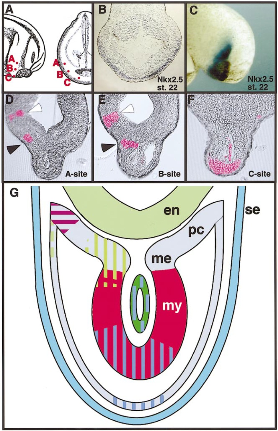 border of the stage 22 Nkx2.5 domain, site B corresponded to the lateral region, and site C was near the ventral midline. (D, E, and F) The positions