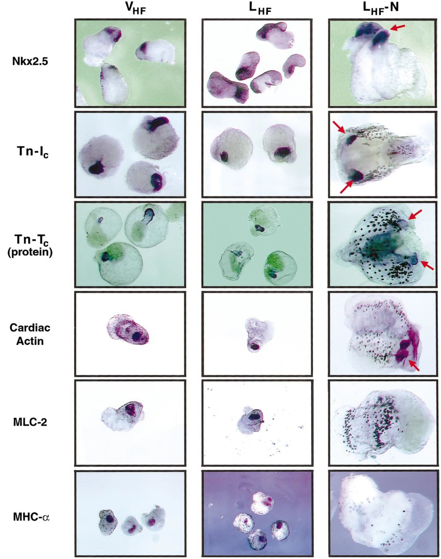 by in situ hybridization. Beating LHF (A) as well as nonbeating LHF (B) and LHF-N (C) explants formed a myocardial tube lined with unstained,